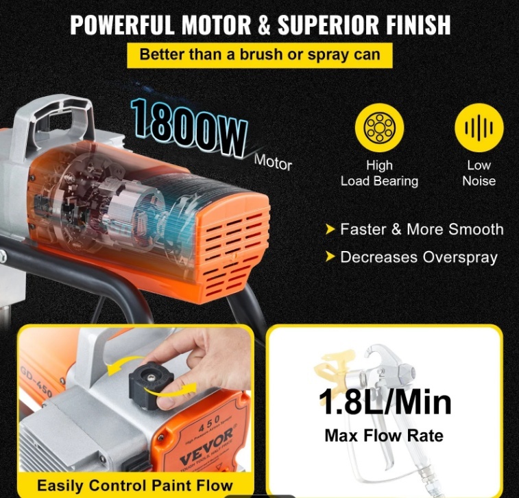 Augstas efektivitātes bezgaisa tehnoloģija: Pateicoties bezgaisa tehnoloģijai, šī sienu krāsas smidzinātāja pistole var labāk atrisināt burbuļu, plaisu un citu problēmu novēršanu. Tā ir konstruēta ar īpaši klusu bezbirstes 1800 W motoru; maksimālā plūsmas ātrums ir 1,8 l/min; maksimālais spiediens ir 3000 psi ± 10 %. Materiāla plūsmas vadības pogu var regulēt, lai ātri palielinātu vai samazinātu materiāla padevi.