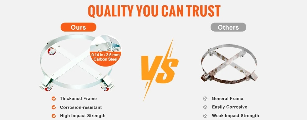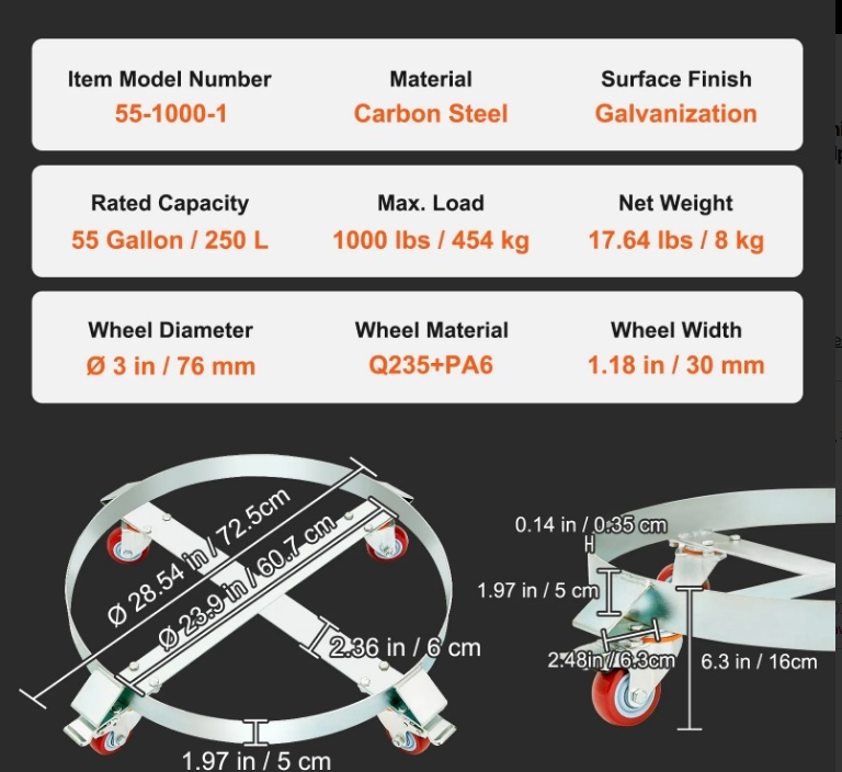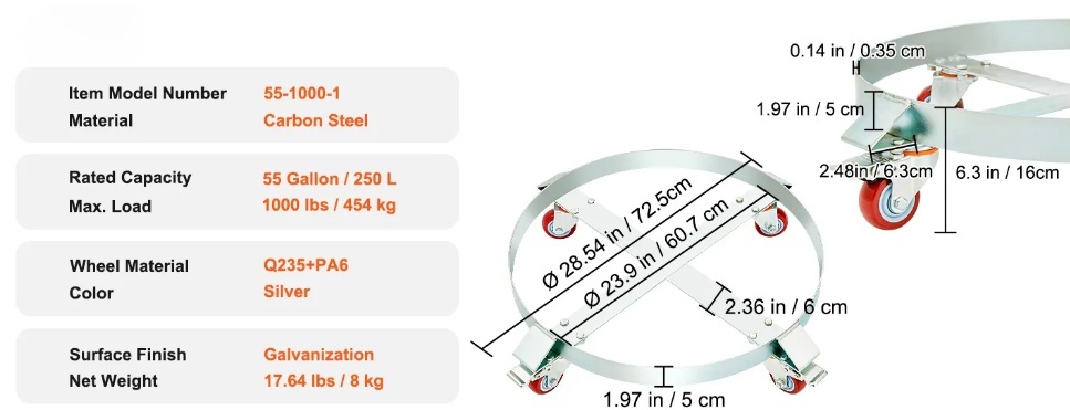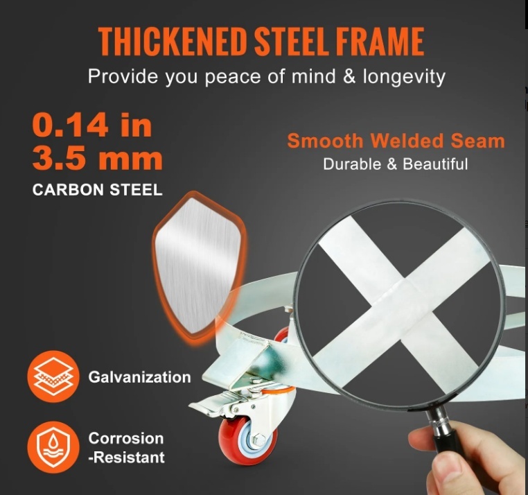 Izturīga tērauda konstrukcija: 55 galonu mucu ratiņi ir izgatavoti no augstas kvalitātes oglekļa tērauda ar 0,14 collu / 3,5 mm biezāku rāmi, lai nodrošinātu izturību. Cinkotā apdare korozijas izturībai un šķērssiksnas dizains novērš deformāciju vai apgāšanos.