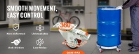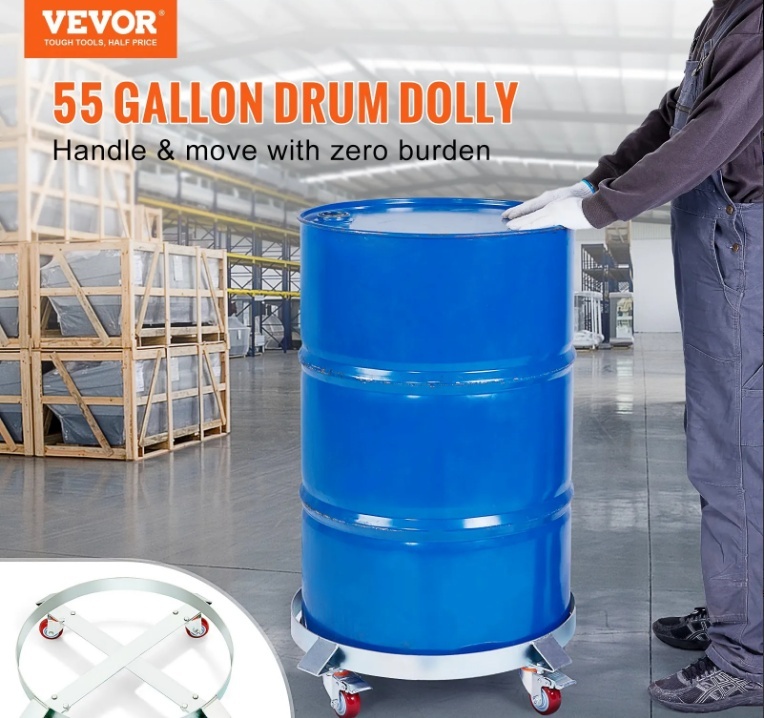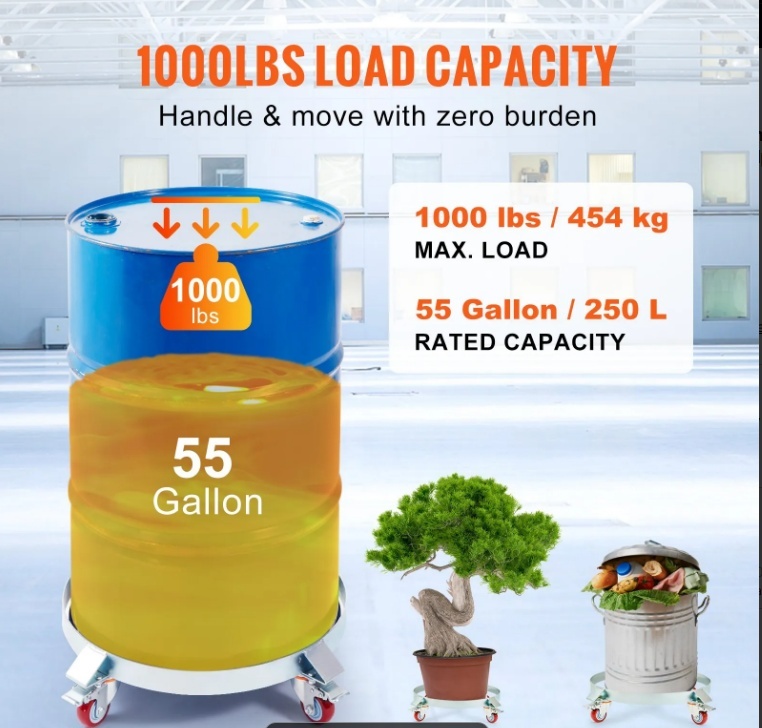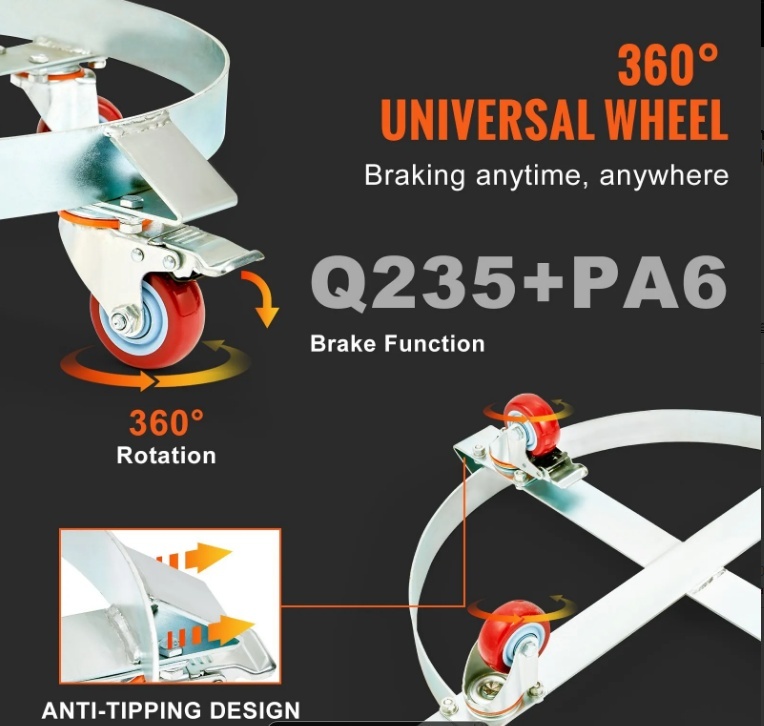 VEVOR mucu ratiņu maksimālā kravnesība ir 1000 mārciņas (453 kg), un tie var apstrādāt mucas līdz 55 galoniem (248 litriem). Universālie riteņi ar bremzēm atvieglo lietotājam virziena kontroli.