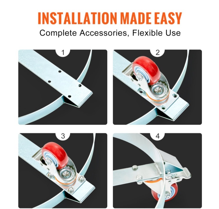 Vienkārša uzstādīšana: Mēs nodrošinām visu nepieciešamo eļļas mucu ratiņu uzstādīšanai, tostarp 2 x universālos riteņus ar bremzi, 2 x universālos riteņus, 16 x M8*16 skrūves, 16 x plakanās paplāksnes, 16 x atsperpaplāksnes, 16 x sešstūra uzgriežņus.