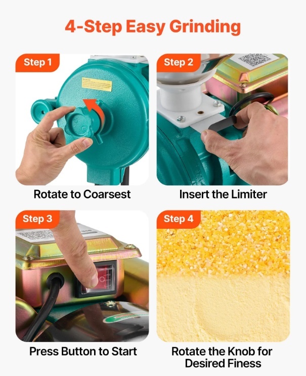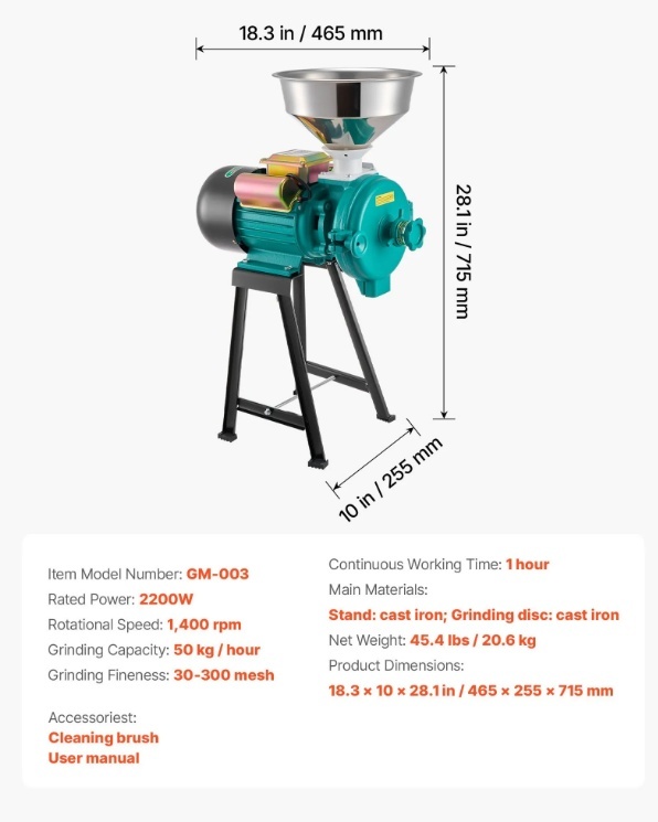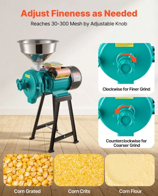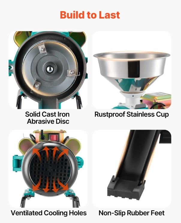 Daudzfunkcionāla sauso materiālu dzirnaviņas: šīs elektriskās graudu dzirnaviņas ir piemērotas tādu graudu kā kviešu, sojas pupiņu, kukurūzas un kafijas pupiņu, kā arī garšvielu, piemēram, piparu, kanēļa un anīsa, malšanai. Nav paredzētas mitriem, eļļainiem vai lipīgiem materiāliem un ir ideāli piemērotas rančo, fermām, mājām un laboratorijām.