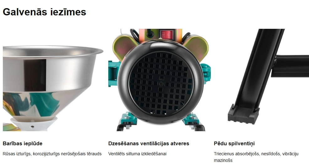 Šīs 2200 W graudu dzirnaviņas piedāvā regulējamu smalkuma kontroli, ātrgaitas 1400 apgr./min malšanu, izturīgu čuguna un nerūsējošā tērauda konstrukciju, efektīvu dzesēšanu un stabilu, neslīdošu darbību ilgstošai veiktspējai.