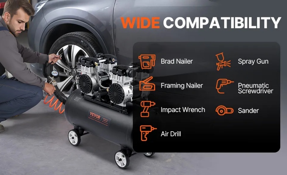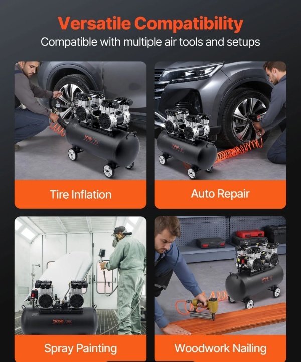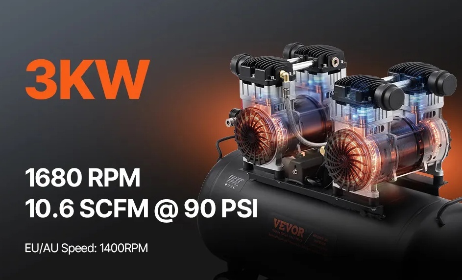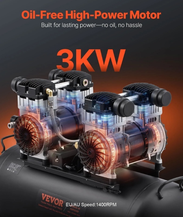Šim horizontālajam gaisa kompresoram ir 4 ZS bezeļļas motors, kas nodrošina pietiekamu jaudu, lai apmierinātu dažādu pneimatisko instrumentu prasības. Tas piedāvā pietiekamu gaisa un jaudas atbalstu naglošanas, krāsošanas un citiem darbiem.