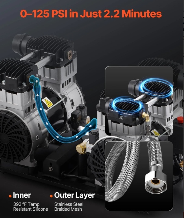 Ātra un efektīva piepūšana: Mūsu bezeļļas gaisa kompresors izmanto caurulīšu un cilindru ieplūdes cauruli, efektīvi ietaupot laiku un pūles. Ieplūdes caurule ir izgatavota no augstas temperatūras izturīga silikona un nerūsējošā tērauda pinuma sieta ar dubultu aizsardzību, lai samazinātu bojājumus un koroziju.