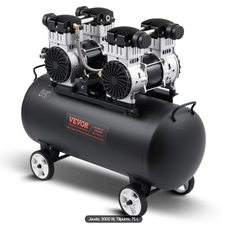 VEVOR gaisa kompresors, 75L tērauda tvertne, 4 ZS , 10,6 CFM , 90 PSI eļļas nesaturošs , maks. 125 PSI spiediens