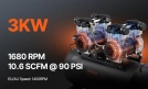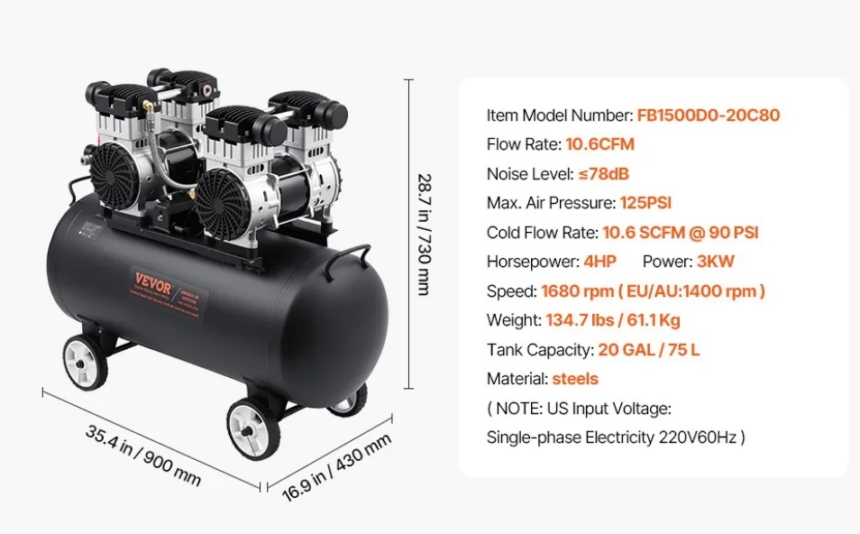 20 galonu gaisa kompresors: mūsu 3 kW bezeļļas motors darbina kompresoru līdz ātrumam 1400 apgr./min un 10,6 CFM pie 90 PSI gaisa padeves. Tas ir ideāli piemērots dažādiem pneimatiskajiem un gaisa instrumentiem, piemēram, naglu pistolei, trieciena uzgriežņu atslēgām, smidzināšanas pistolei, pneimatiskām skrūvgriežiem, vislabāk piemērots riepu piepūšanai, automašīnu remontam, krāsošanai ar smidzināšanu, koka naglošanai utt.