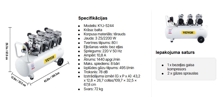 80 litru ietilpība un bezeļļas sūknis