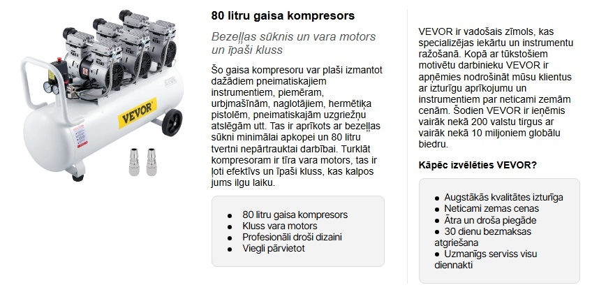 Gaisa kompresoram ir 80 litru tvertne, lai maksimāli palielinātu pneimatisko instrumentu veiktspēju. Turklāt tas ir aprīkots ar bezeļļas sūkni minimālai apkopei.