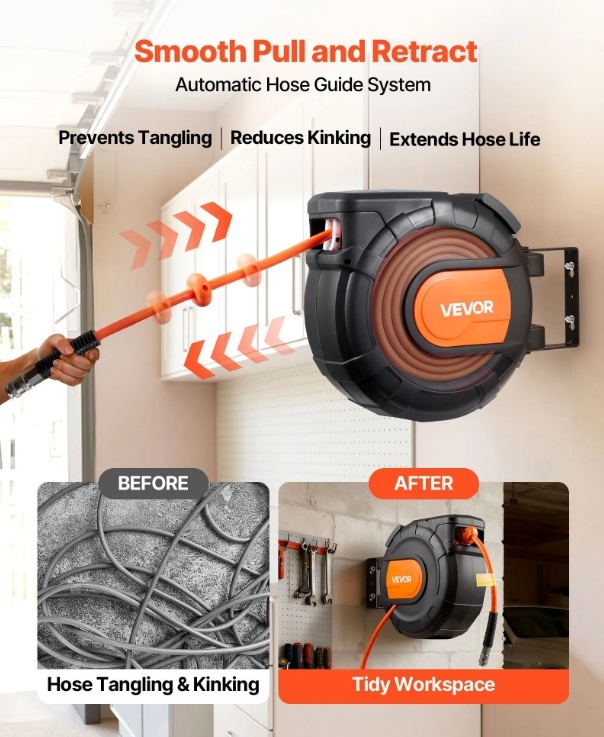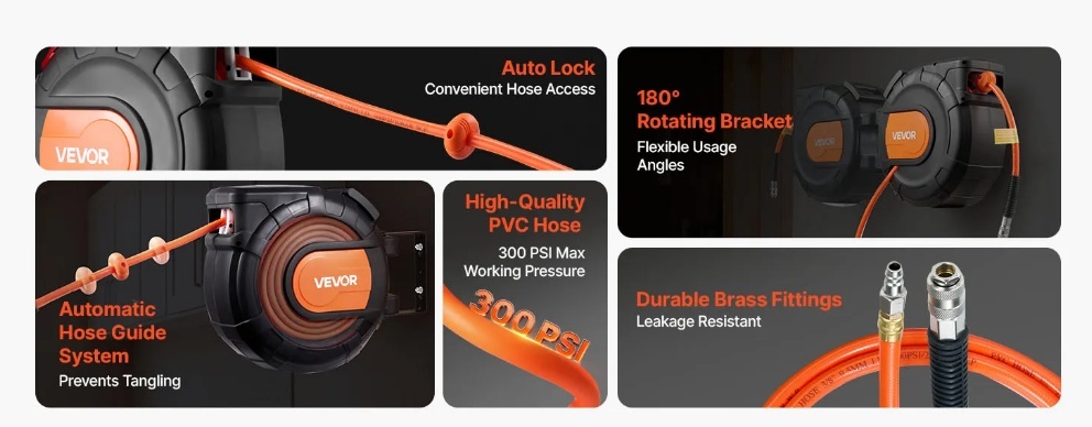 Vairs nekādu sapinušos šļūteņu: VEVOR izvelkamā gaisa šļūtenes spole ietver 20 m x 9,5 mm PVC gaisa šļūteni un 2 m ievada šļūteni, lai jūsu darba vieta būtu kārtīga un nesapinusies. Vairs nekādu šļūteņu vilkšanos pa grīdu, samazinot nodilumu un paklupšanas risku, nodrošinot drošāku lietošanu.