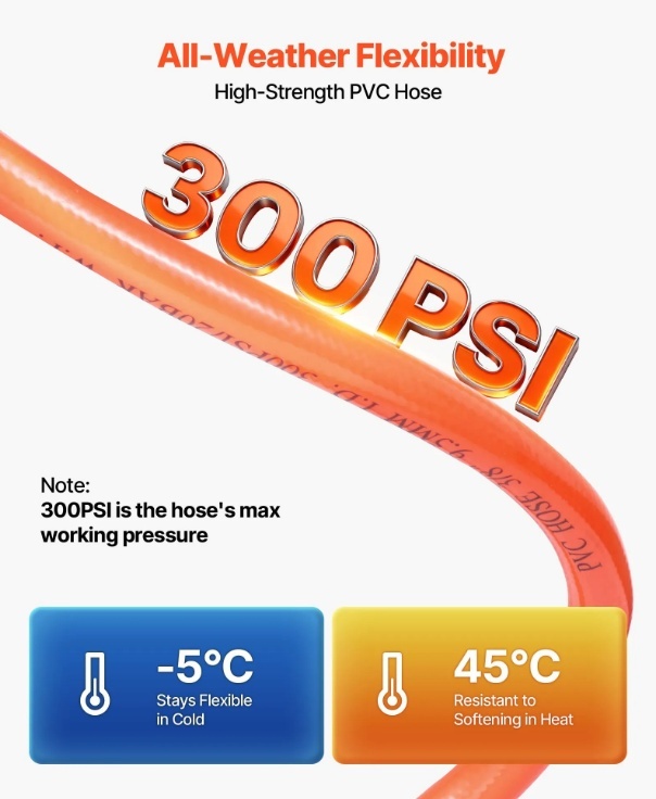 Izturīga un elastīga: mūsu PVC gaisa šļūtene iztur spiedienu līdz 300 PSI un droši darbojas no -5 ℃ līdz 45 ℃, pretojoties sagriešanās, saspiešanas un plīšanas procesam, nodrošinot vienmērīgu gaisa plūsmu. Slēgtā plastmasas spole ir viegla un izturīga, nodrošina spēcīgu triecienizturību un aizsargā šļūteni no bojājumiem.
