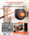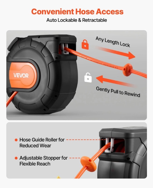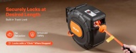 Automātiska attīšana: Viegli pārvaldiet šļūteni ar automātiskās attīšanas sistēmu — vienkārši viegli pavelciet to, un tā vienmērīgi attinās. Regulējams aizbāznis un iebūvētais sliežu bloķētājs ļauj nostiprināt šļūteni jebkurā garumā, un neķerošie rullīši to vienmērīgi vada, lai samazinātu nodilumu.