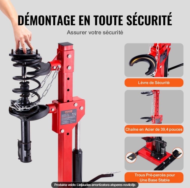 Lai maksimāli palielinātu drošību atsperu demontāžas un montāžas laikā, esam integrējuši drošības mēlītes, pagarinātu drošības ķēdi un stabilu H formas pamatni. Šīs funkcijas nodrošina drošu darbību, samazinot šūpošanās risku.