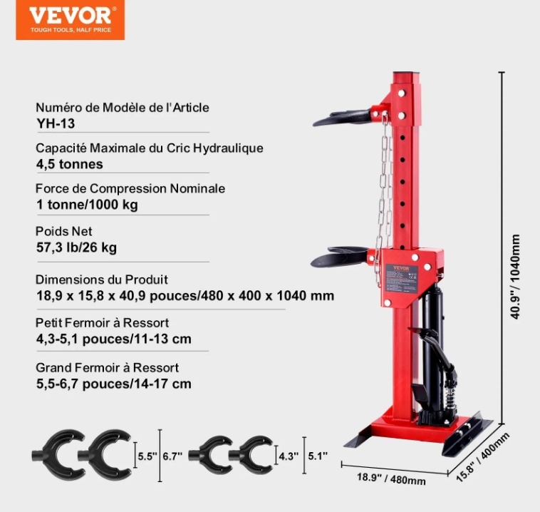 4,5 tonnu hidrauliskā celtspēja: Hidrauliskajam domkratam ir 4,5 tonnu celtspēja, un nominālais saspiešanas spēks ir 1 tonna. Mūsu spirālatsperu kompresors ir lieliski piemērots dažādiem transportlīdzekļu tipiem, tostarp sedaniem, apvidus auto, bezceļu auto un pikapiem. Lieliski piemērots atsperu demontāžai un amortizatoru apkopei.