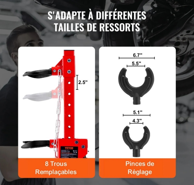 Neatkarīgi no tā, vai esat mehāniķis vai strādājat specializētās darbnīcās, šis VEVOR statņu atsperu spriegotājs ir daudzpusīgs un regulējams. Tas ir aprīkots ar diviem skavu komplektiem. Tas ļauj tam apstrādāt dažādus atsperu izmērus. Skavas izmērs ir no 4,3"-5,1" līdz 5,5"-6". Tas padara to piemērotu dažādiem pielietojumiem. Instruments ir ideāli piemērots lietošanai mājās vai profesionālās darbnīcās. Tā pielāgojamība nodrošina, ka tas atbilst dažādām vajadzībām. Izvēloties instrumentu dažādiem atsperu darbiem, varat paļauties uz instrumenta daudzpusību un uzticamību. Šis instruments ļauj viegli tikt galā ar jebkuru atsperu darbu.