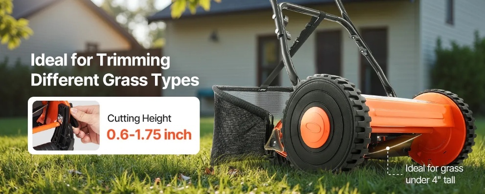 Precīza un vienmērīga pļaušana: Stumjamajam zāles pļāvējam ir 16 collu platums un 5 asmeņu konstrukcija, kas nodrošina precīzu un vienmērīgu pļaušanu. Regulējams pļaušanas augstums (no 0,6 līdz 1,75 collām) atbilstoši dažādiem gadalaikiem un zāles tipiem. Lai iegūtu optimālus rezultātus, apgrieziet zāli, kas ir īsāka par 4 collām, un otrajai pļaušanai nolaidiet asmeni atbilstoši zāles augstumam.