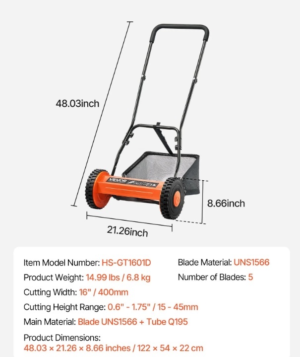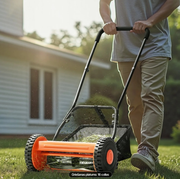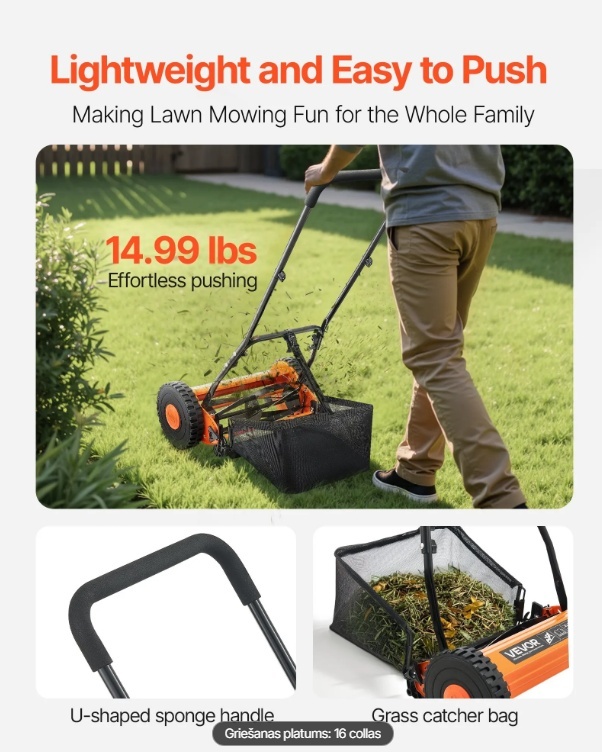 Šis 16 collu stumjamais zāles pļāvējs ar pieciem 65Mn tērauda asmeņiem nodrošina precīzu un vienmērīgu pļaušanu maziem un vidējiem zālājiem. Regulējamā augstuma konstrukcija ir piemērota dažādiem zāles veidiem, un lielie riteņi un rokturis ar sūkli samazina pļaušanas piepūli. Komplektā iekļautais zāles savākšanas maiss atvieglo tīrīšanu.