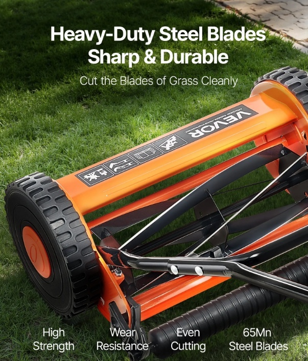 Izturīga konstrukcija: Mūsu manuālajam stumjamajam zāles pļāvējam ir pieci augstas kvalitātes UNS1566 tērauda asmeņi ilgstošai veiktspējai un asumam. Triecienizturīgais dizains nodrošina uzticamus rezultātus vairākkārtējai apgriešanai. Ja lietošanas laikā tas iesprūst, varat to vienkārši pavilkt atpakaļ, lai notīrītu zarus vai lapas.