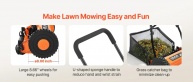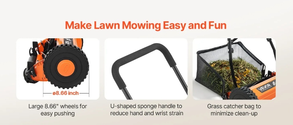 Pārnēsājama un vienkārša montāža: Vienkārši piestipriniet rokturi pie rokas stumjamā ruļļa zāles pļāvēja galvenās iekārtas, un jūs esat gatavs darbam. Ātra montāža bez instrumentiem aizņem apmēram 10 minūtes. Sāciet ātri un ietaupiet vērtīgo laiku, lai jūs varētu nekavējoties baudīt zāliena pļaušanu.