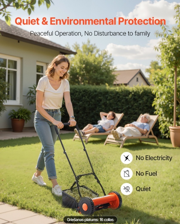 Vides aizsardzība un klusa darbība: Nav nepieciešamas baterijas, elektrība vai degviela. Šis zāles pļāvējs ar ruļļiem nerada izmešus un ir kluss. Tas ir ideāli piemērots ģimenēm ar bērniem vai mājdzīvniekiem, vienlaikus rūpējoties par kaimiņiem. Izbaudiet mierīgu un zaļu dārzkopību.