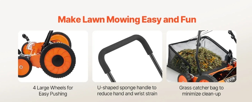 Pārnēsājama un vienkārša montāža: Vienkārši piestipriniet rokturi pie rokas stumjamā ruļļa zāles pļāvēja galvenās iekārtas, un jūs esat gatavs darbam. Ātra montāža bez instrumentiem aizņem apmēram 10 minūtes. Sāciet ātri un ietaupiet vērtīgo laiku, lai jūs varētu nekavējoties baudīt zāliena pļaušanu.