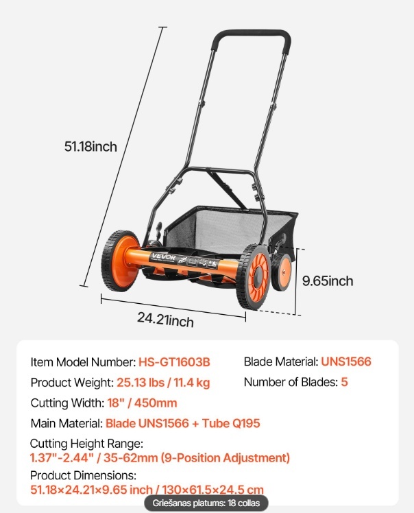 Precīza un vienmērīga pļaušana: Stumjamam zāles pļāvējam ir 18 collu platums un 5 asmeņu konstrukcija, kas nodrošina precīzu un vienmērīgu pļaušanu. Regulējams pļaušanas augstums (no 1,37 līdz 2,44 collām) atbilstoši dažādiem gadalaikiem un zāles tipiem. Lai iegūtu optimālus rezultātus, apgrieziet zāli, kas ir īsāka par 4 collām, un otrajai pļaušanai nolaidiet asmeni atbilstoši zāles augstumam.