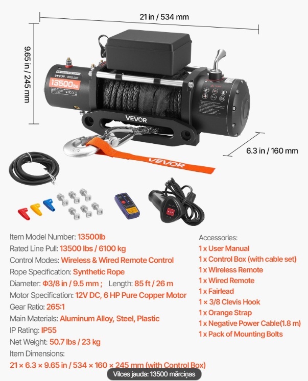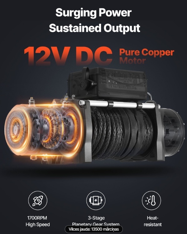 VEVOR-elektriskā vinča, celtspēja 6100 kg, 12 V līdzstrāvas vinča ar Φ9,5 mm x 26 m sintētisko virvi