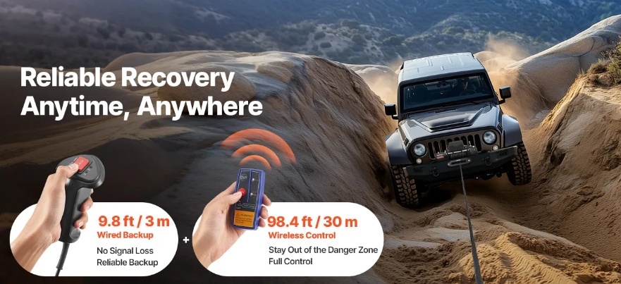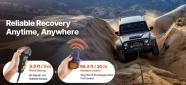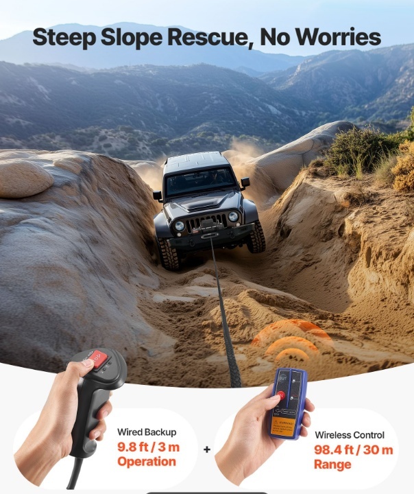 Droša tālvadības pults: 98 pēdu (27 m) garā vinčas bezvadu tālvadības pults ļauj atrasties drošā attālumā darbības laikā. Kā rezerves komplektā ir iekļauta 9,8 pēdu (27 m) gara vadu tālvadības pults, kas ir ideāli piemērota kalnu takām vai vietām ar vāju signālu.