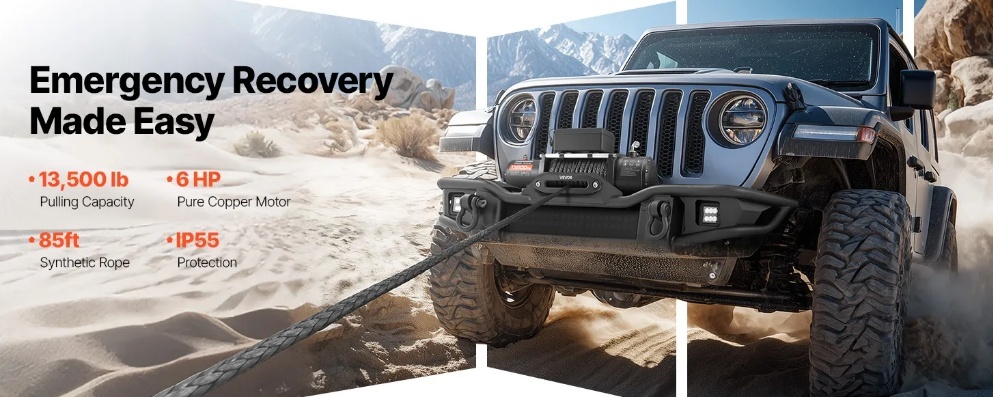 Jaudīga glābšana: Šis džipa vinčas 6 ZS motors ar 265:1 trīspakāpju planetāro pārnesumu nodrošina vienmērīgu vilkšanas spēku. Tas darbojas ilgas stundas bez pārkaršanas, nodrošinot uzticamu spēku glābšanai bezceļos.