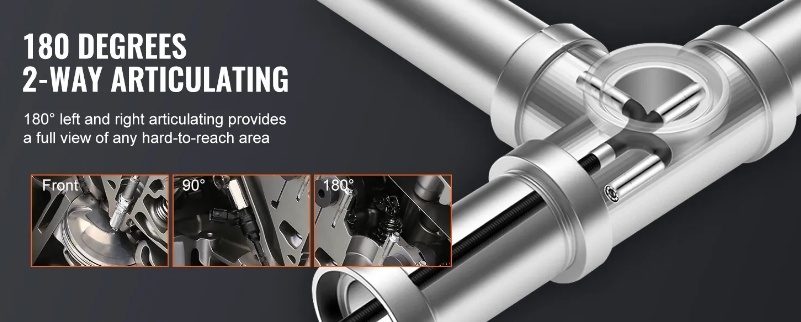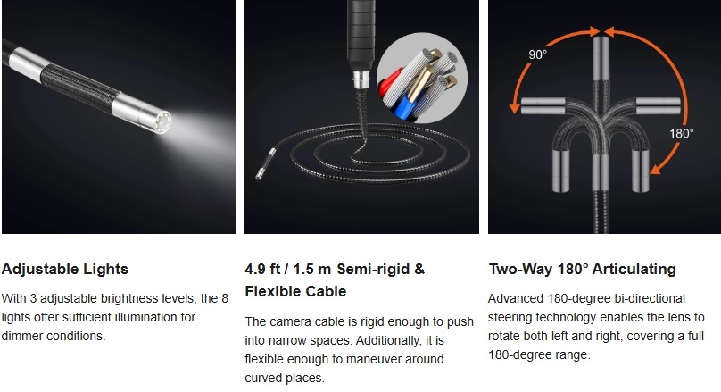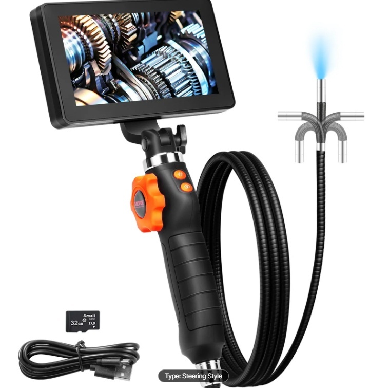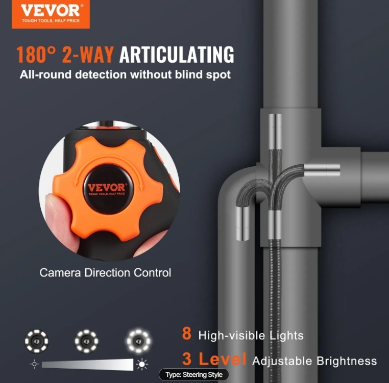 VEVOR endoskops ir uzlabots ar uzlabotu 180° divvirzienu stūrēšanas tehnoloģiju, kas palīdz iegūt dažādus skatus no visām pusēm. 5 collu IPS ekrāns un 8x digitālā tālummaiņa skaidri attēlo reāllaika video. 8 LED gaismas ar 3 regulējamiem spilgtuma līmeņiem nodrošina skaidru attēlu pat tumšos apstākļos.