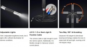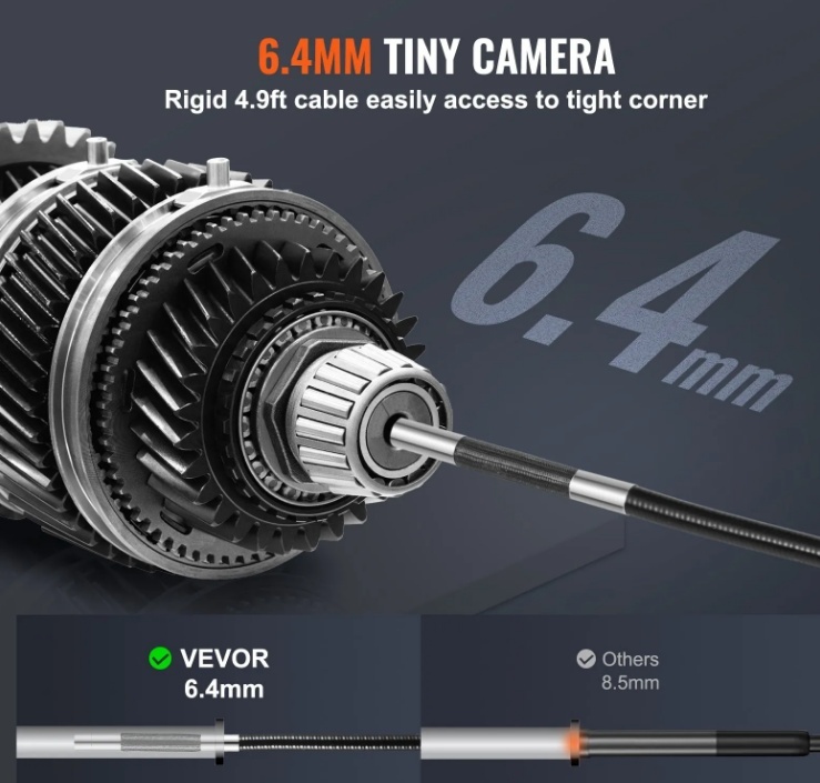 Īpaši maza kamera: Salīdzinot ar citiem 8,5 mm objektīviem, mūsu 6,4 mm IP67 ūdensizturīgais, īpaši plānais objektīvs nodrošina vieglāku piekļuvi grūti sasniedzamām vietām. Boreskopa kamera ar 8 gaismām un 3 regulējamiem spilgtuma līmeņiem nodrošina pietiekamu apgaismojumu tumšākām situācijām. Unikālā augstas temperatūras aizsardzība arī labi pasargās jūsu endoskopu, jo, kad objektīva temperatūra pārsniedz 85 ℃, kamera iedarbinās skaņas signālu, lai brīdinātu lietotāju par augstas temperatūras stāvokli.
