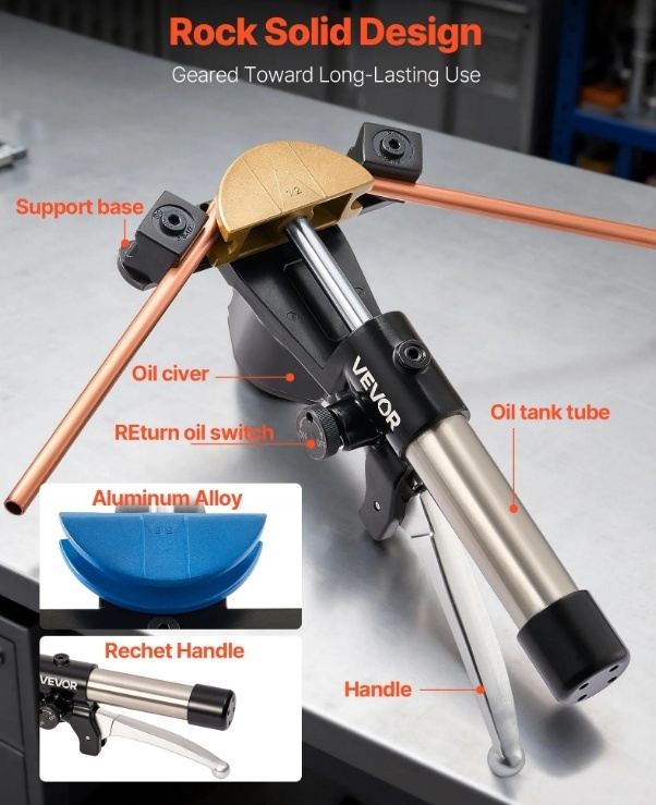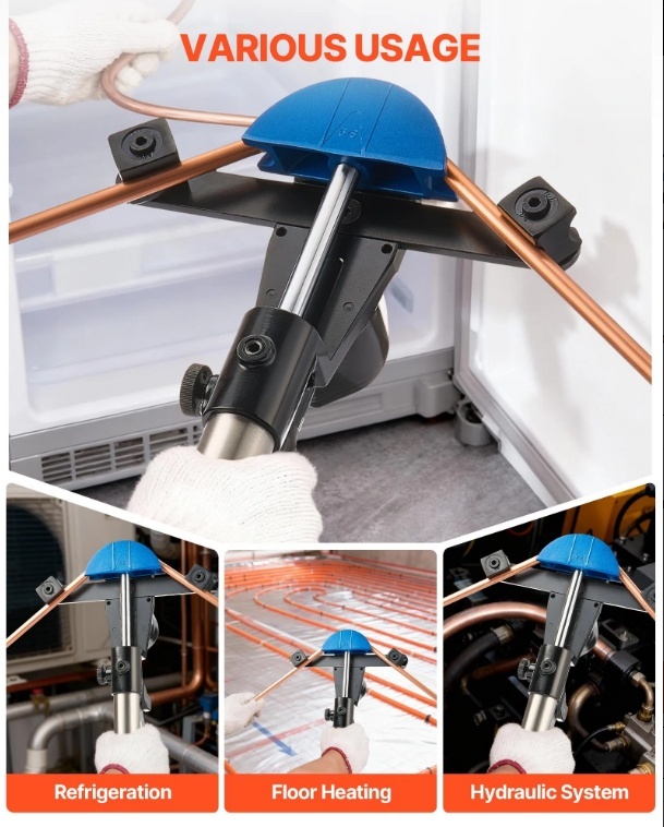 Gatavs katram locījumam: Šis hidrauliskais vara cauruļu locītājs ir ideāli piemērots HVAC un saldēšanas sistēmām, automobiļu remontam, ūdensvada uzstādīšanai un hidraulisko/pneimatisko sistēmu apkopei.