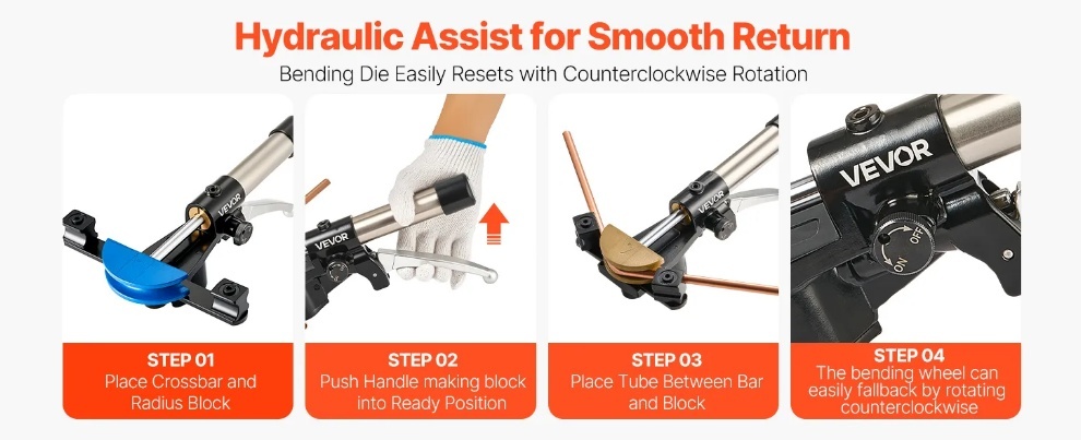 Pēc saliekšanas vienkārši pagrieziet pretēji pulksteņrādītāja virzienam, lai nekavējoties atiestatītu. Šim HVAC cauruļu liekšanas instrumentu komplektam ir hidrauliska palīgsistēma vienmērīgai atgriešanai un vienkāršai darbībai.