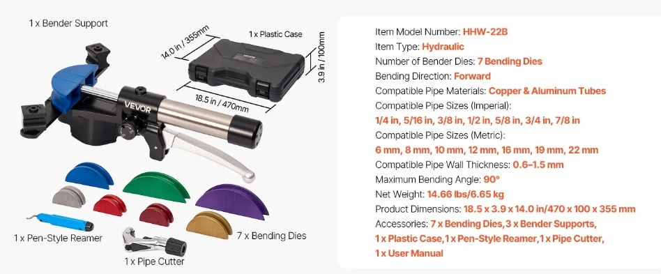 Darbināms ar hidraulisko sistēmu, šis cauruļu liekšanas instruments viegli saliec vara un alumīnija caurules no 1/4 collām līdz 7/8 collām (6 līdz 22 mm). Ar 0° līdz 90° lieces leņķi, 7 alumīnija sakausējuma matricām un divvirzienu lieces dizainu tas ir paredzēts HVAC uzstādīšanai, automašīnu remontam un rūpnieciskajai apkopei.