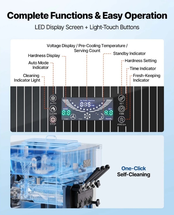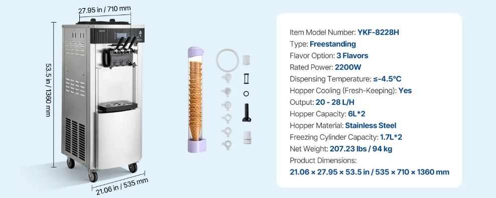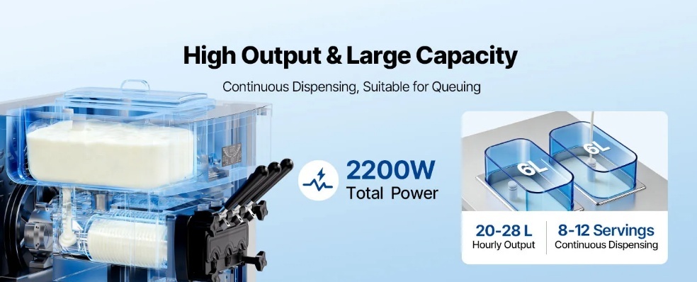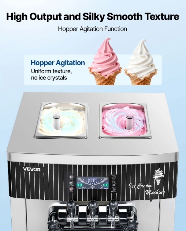 VEVOR komerciālā saldējuma mašīna piegādā līdz 20–28 l/h, vienlaikus pasniedzot trīs garšas. Aprīkota ar iepriekšēju dzesēšanu, piltuves maisīšanu un augstas veiktspējas kompresoru, tā nodrošina vienmērīgu padevi ar smalku, viendabīgu tekstūru, vienlaikus saglabājot efektīvu ražošanu.