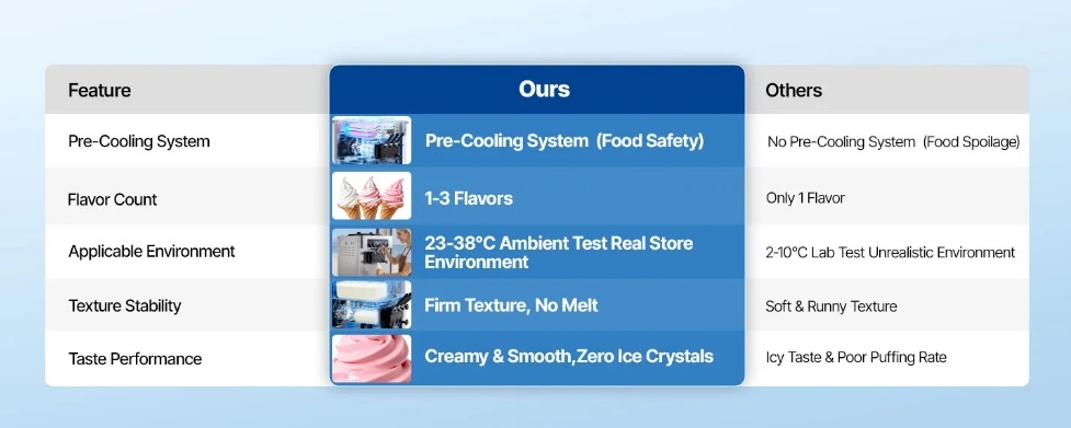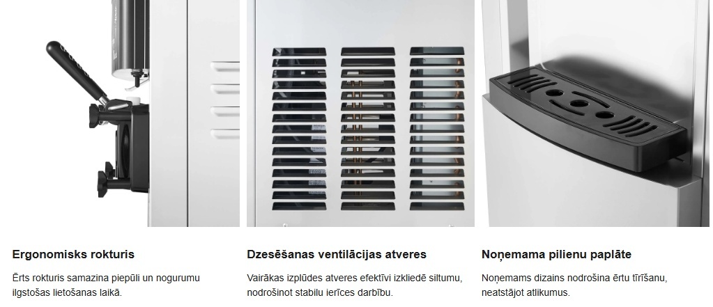 Augstas efektivitātes ražošana: aprīkots ar 3 dozatoriem, lai atbalstītu 2+1 garšas dažādām gaumēm. Darbojoties ar efektīvu kompresoru un divām 6 litru tvertnēm, pirmā partija sasalst 13–17 minūtēs, bet nākamās partijas ir gatavas 3–5 minūtēs, lai nodrošinātu vienmērīgu piegādi pīķa stundās.