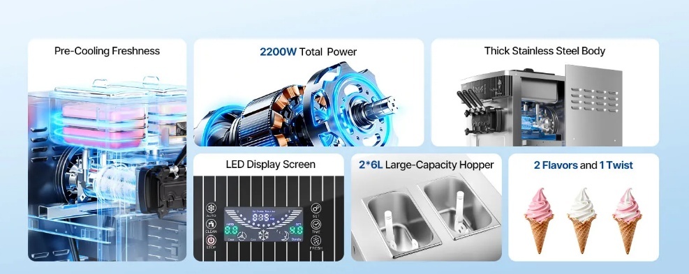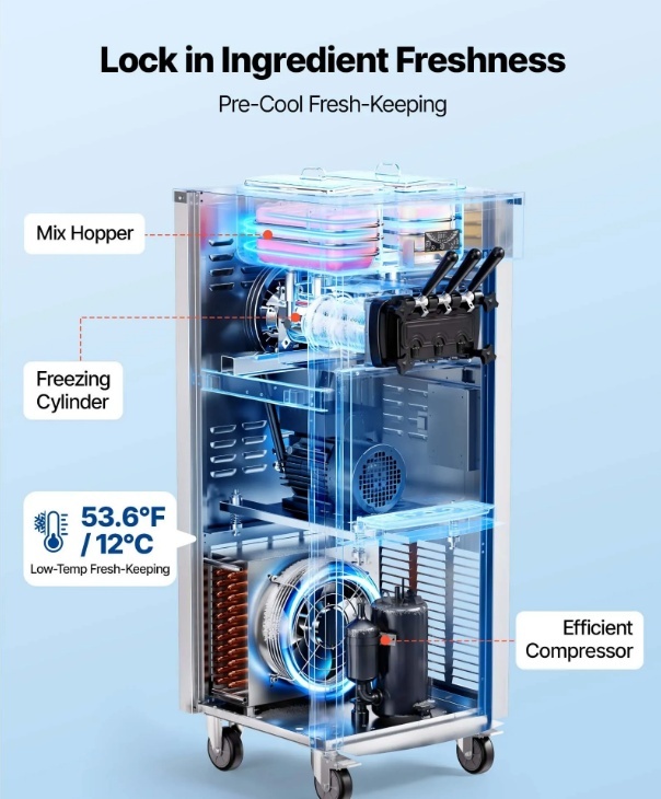 Svaiguma saglabāšanas iepriekšēja atdzesēšana: VEVOR brīvstāvošā komerciālā saldējuma mašīna var saražot līdz 20–28 l/h, nepārtraukti nodrošinot 8–12 porcijas bez pārtraukumiem. Svaiguma saglabāšanas iepriekšējas atdzesēšanas sistēma atdzesē maisījumu līdz ≤12 °C, nodrošinot tā svaiguma saglabāšanu un novēršot bojāšanos pat augstā temperatūrā vai uzglabāšanas laikā uz nakti.