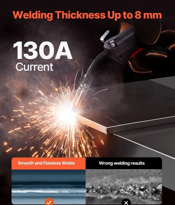 Jaudīgs MIG metināšanas aparāts: Šis 130 A MIG metināšanas aparāts ir paredzēts bezgāzes MIG metināšanai ar fluksa serdi. Tam ir spēcīga 130 A izejas strāva, tas atbalsta metināšanas biezumu līdz 8 mm un ir saderīgs ar tādiem materiāliem kā mīkstais tērauds, nerūsējošais tērauds, čuguns, lokšņu metāls un kvadrātveida caurules.