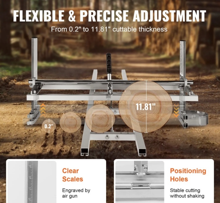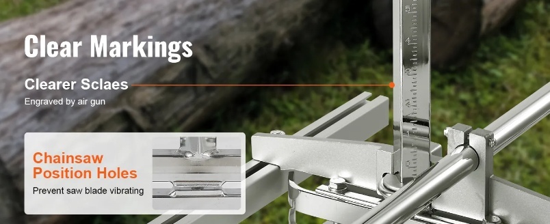 Precīza un stabila griešana: Ar gaisa pistoli izgrebtas skalas nodrošina ļoti precīzus mērījumus, savukārt motorzāģa pozicionēšanas caurumi nodrošina stabilu un nekustīgu griešanu, garantējot precīzu un skaidru nepieciešamā koksnes biezuma griešanu. Sasniedziet profesionāla līmeņa precizitāti un skaidrību kokapstrādē.