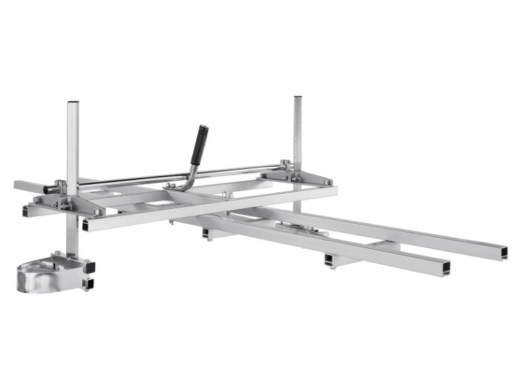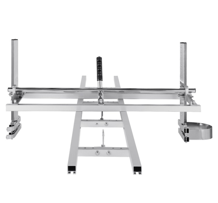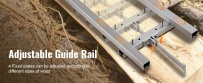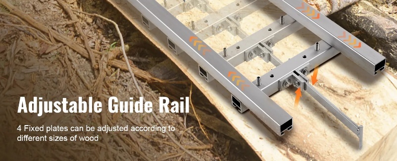 Regulējama sliežu frēzes vadotne: 4 fiksētas plāksnes uz vadotnes var regulēt atbilstoši dažādiem koksnes izmēriem, palīdzot viegli un ātri pielāgot vadotni, lai nostiprinātu baļķus un izveidotu perfektu horizontālu griezumu gar baļķiem.