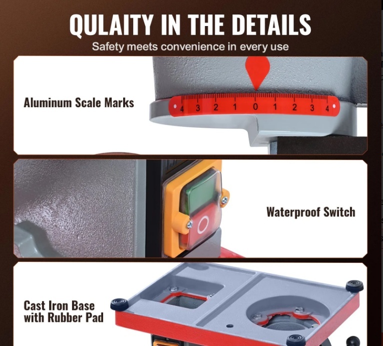 Praktiski un cilvēciski pielāgoti dizaini: kvalitāte detaļās! Mūsu karbīda asmeņu asinātājs ir optimizēts ar daudziem pārdomātiem dizainiem: skaidrām un precīzām alumīnija skalas atzīmēm, ūdensnecaurlaidīgu slēdzi drošībai un ilgmūžībai, kā arī čuguna pamatni ar gumijas paliktni, kas uzlabo stabilitāti un samazina vibrācijas.