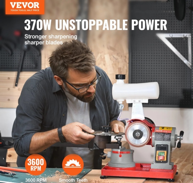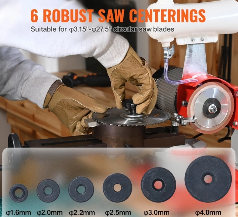 Apnicis neass riņķveida zāģa asmenis? VEVOR riņķveida zāģa asmeņu asinātājs lepojas ar jaudīgu 370 W motoru ātrākai asmeņu asināšanai. Sadarbojoties ar 6 dažāda izmēra zāģa centrēšanas punktiem un ūdens tvertni efektīvai dzesēšanai, tas viegli novērš neasumu un nodilumu, apmierinot dažādas asmeņu asināšanas vajadzības!