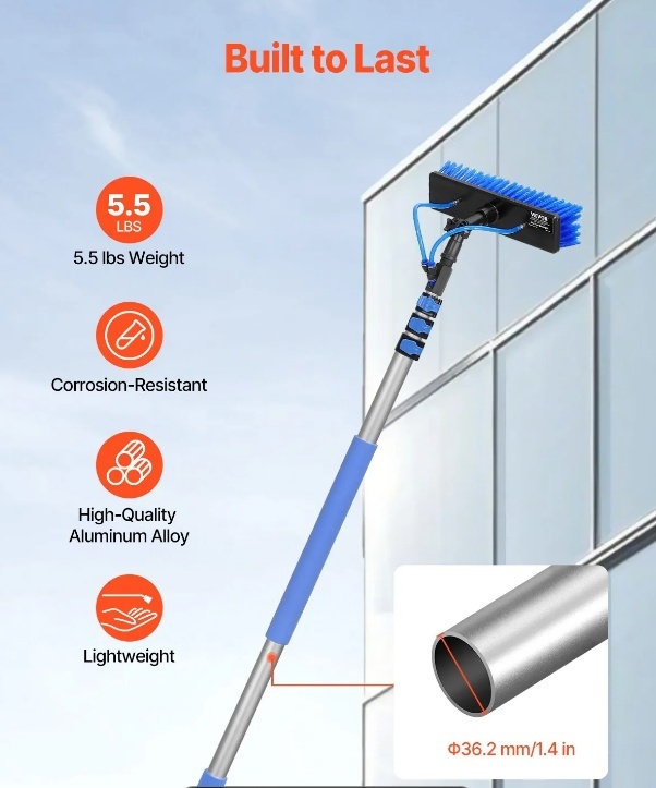Izturīgs un stabils: Šī logu tīrīšanas birste un kāts ir izgatavoti no augstas kvalitātes alumīnija sakausējuma, tie ir izturīgi pret koroziju un viegli (tikai 2,5 kg). Lieliski piemēroti lietošanai ārā jebkuros laikapstākļos, tie ir pietiekami izturīgi, lai veiktu visus jūsu saules paneļu tīrīšanas uzdevumus, vienlaikus esot viegli manevrējami.