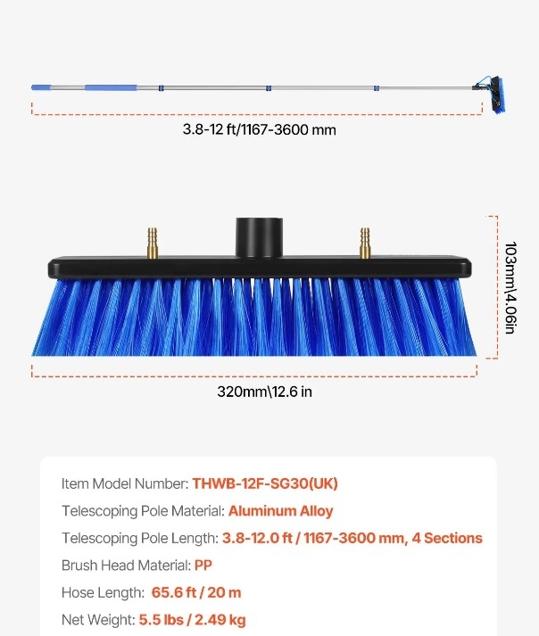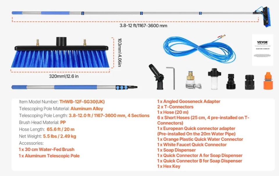 Pilns piederumu komplekts: Ūdens padeves kāta birstes komplektā ietilpst 20 m (65,6 pēdu) gara šļūtene ērtai pieslēgšanai ūdens avotam. Tas ietver vairākus ātrus stiprinājumus standarta dārza šļūtenēm vai tīra ūdens sistēmām, padarot to par ideālu saules paneļu tīrīšanas birsti un kāta komplektu gan dzīvojamām, gan komerciālām vajadzībām.