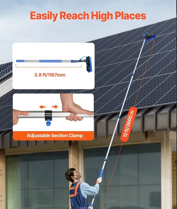 Regulējams ar ūdeni barojams kāts: Saules paneļu tīrīšanas kāts izstiepjas līdz 3,6 metriem (12 pēdām), un tam ir drošs fiksators ērtai augstuma regulēšanai. Tas ļauj droši un efektīvi tīrīt saules paneļus vai logus, neizmantojot kāpnes. Viegls un ērti lietojams, tas ir ideāli piemērots tīrīšanai pašu spēkiem.