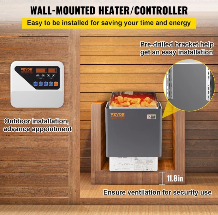 Pie sienas stiprināms dizains: Pateicoties iepriekš urbtam kronšteinam, kas pilns ar rezervētiem spriegotājiem un slēptiem spriegotājiem, jūs iegūstat darbietilpīgu uzstādīšanu. Ieteicams uzstādīt tvaika pirts sildītāju 30 cm (11,8 collu) augstumā no grīdas, lai nodrošinātu labāku siltuma izkliedi un drošu lietošanu.
