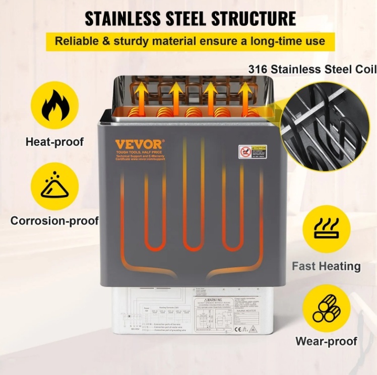 430 nerūsējošais tērauds: Mūsu pirts krāsns ir izgatavota no izcila 430 nerūsējošā tērauda korpusa, kas ir izturīgs pret koroziju un ir izturīgs. Aprīkota ar enerģiju taupošu 316 nerūsējošā tērauda sildīšanas spoli, sildītājs ātri uzsilst. Turklāt virsma ir apstrādāta ar pārklājuma pārklājumu, lai izolētu gaisu un nerūsējošā tērauda kontaktu, tādējādi panākot neoksidēšanās efektu.
