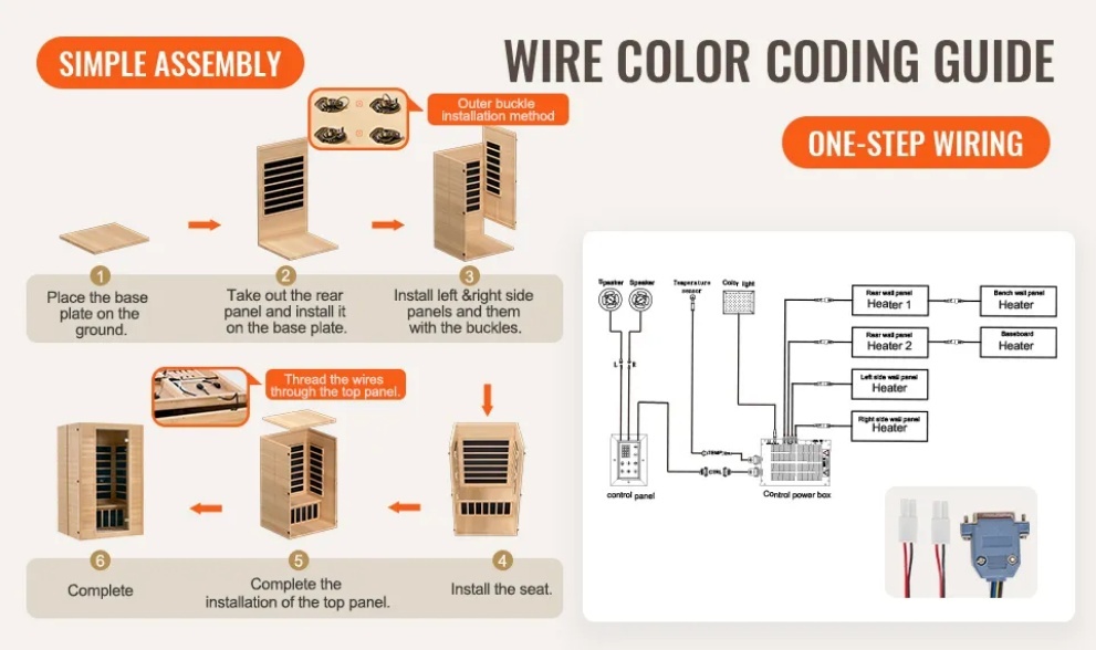 Elektroinstalācijā tiek izmantotas krāsu kodētas norādes, kas padara savienojumus vienkāršus un saprotamus. Mēs piedāvājam pilnīgu elektroinstalācijas shēmu, kas palīdzēs jums viegli sekot līdzi un veiksmīgi uzstādīt saunu.