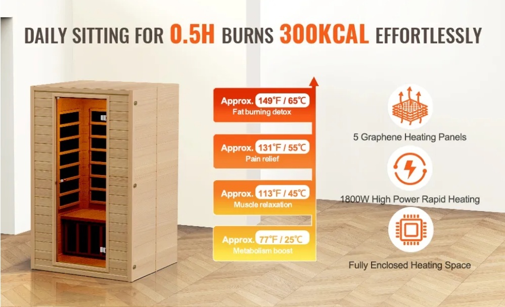 Droša un vienkārša tauku dedzināšana: Ar jaudīgu 1800 W ātrās uzsildīšanas sistēmu sauna piedāvā plašu sildīšanas diapazonu no 77 ℉ līdz 151 ℉. Tā ir ETL sertificēta drošībai ar EMF starojuma vērtību ≤ 3MGS. Iebūvētais tālā infrasarkanā starojuma grafēna sildīšanas panelis var sadedzināt aptuveni 300 kcal tikai 30 minūtēs dienā, palīdzot sasniegt formā esošu ķermeni bez intensīvas fiziskās slodzes.