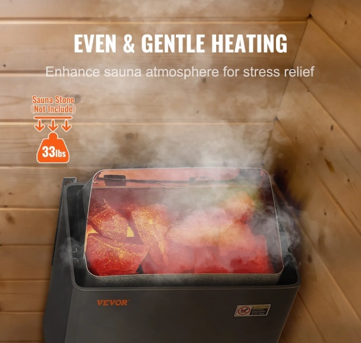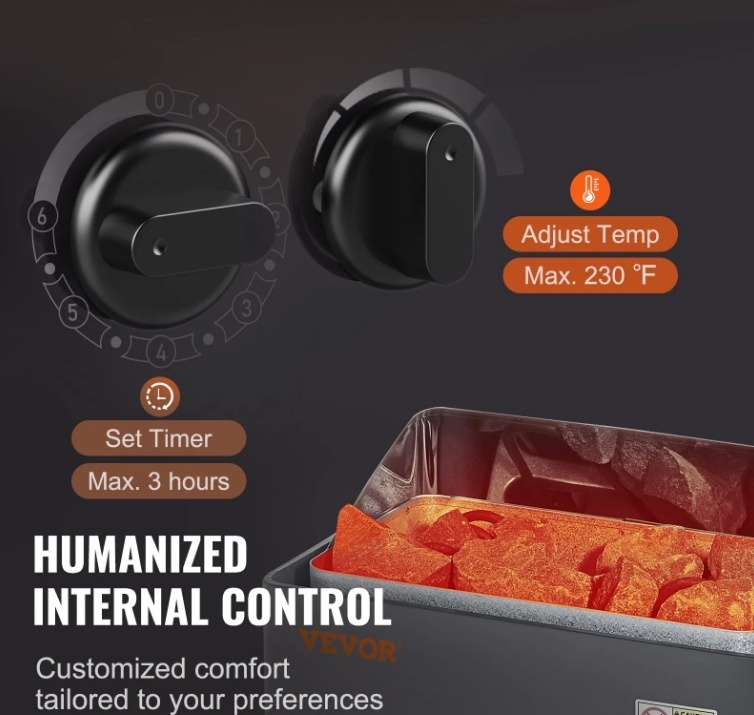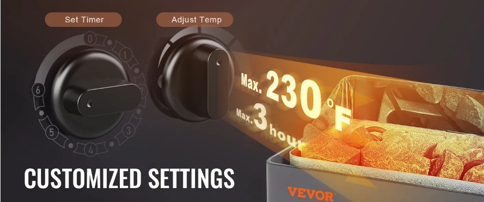 Pielāgojiet temperatūru un laiku: Mājas pirts sildītājam ir lietotājam draudzīgas mehāniskas pogas temperatūras un laika kontrolei, kas sniedz jums iespēju personalizēt pirts pieredzi atbilstoši jūsu komfortam. Ar maksimālo temperatūru 230 ℉ un laika regulēšanas iespēju līdz 3 stundām, jūs pilnībā kontrolējat savu pirts sesiju.