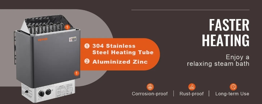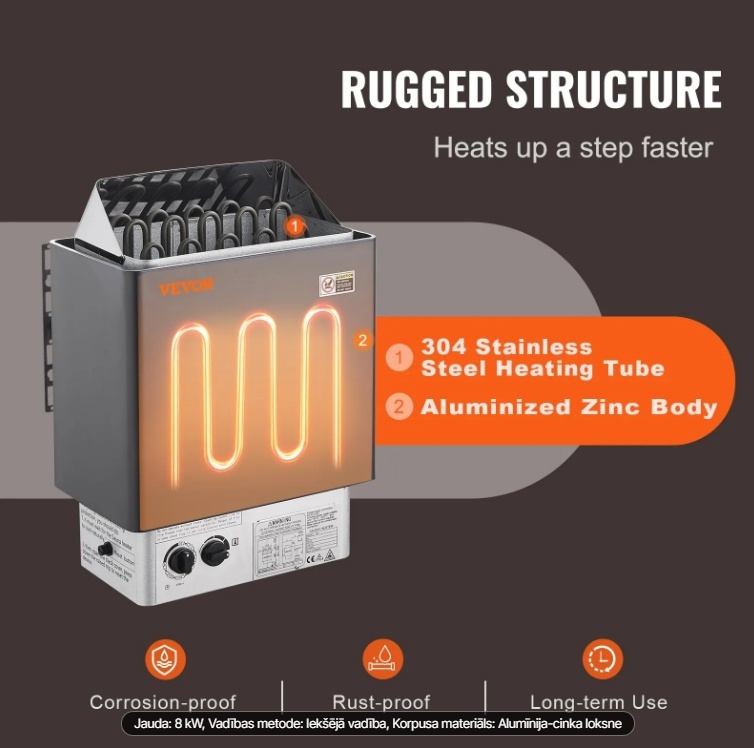 Izturīga konstrukcija: Pirts sildītājam ir alumīnija cinka apvalks, kas nodrošina augstu izturību pret koroziju un ilgu kalpošanas laiku pat augsta mitruma apstākļos. 304 nerūsējošā tērauda sildelements nodrošina ātru un vienmērīgu siltuma sadali, īsā laikā nodrošinot komfortablu pirts pieredzi.